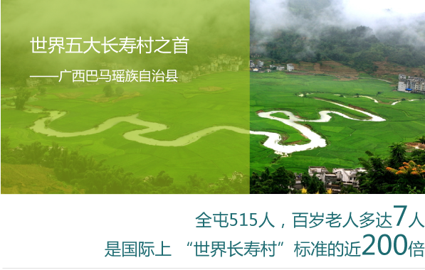 廣西巴馬瑤族自治縣位于廣西盆地和云貴高原的斜坡地帶,總?cè)丝?3萬人。據(jù)廣西巴馬縣民政局消息,截止到2010年6月8日,廣西巴馬瑤族自治縣100歲及以上的長壽老人達87人,每10萬人里有37.826個,是國際長壽村標準的5.043倍。比2000年第五次全國人口普查時74人多13人。是世界五大村中惟一長壽老人不斷增多的地方。被譽為世界五大長壽村之首。其中,一個叫甲篆鄉(xiāng)平安村巴盤屯的地方,全屯515人,百歲老人多達7人,是國際上 “世界長壽村”標準的近200倍。