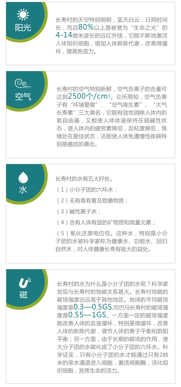總之,長壽村的陽光好、空氣好、水好、磁更好,人類賴以生存的四大要素無一不佳,借用莊子的話說,長壽村的人占據(jù)了“天、地、人合一,人渾一于自然”的佳境。我們現(xiàn)在所處的環(huán)境比起長壽村來說,可謂天壤之別,長壽村的人健康長壽則是天經(jīng)地義的!