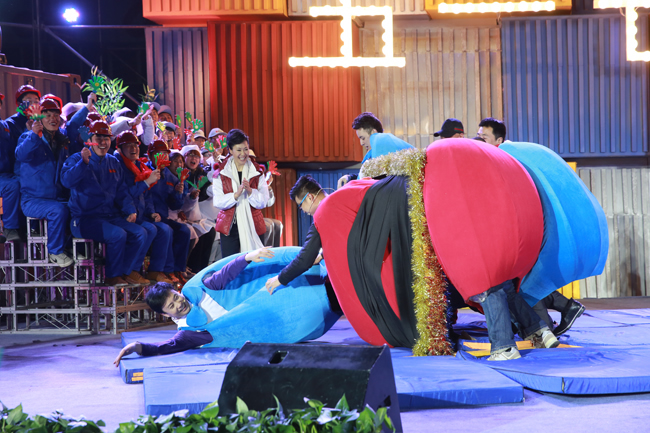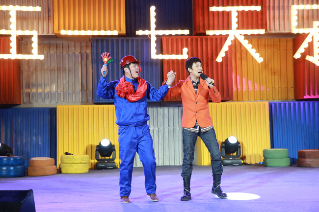 本次《五一七天樂(lè)》節(jié)目的主題是“五一七天樂(lè),勞動(dòng)更快樂(lè)”。節(jié)目在獨(dú)具勞動(dòng)特色的開(kāi)場(chǎng)舞《最炫民族風(fēng)》中拉開(kāi)演出序幕,于文華、管彤推著小推車(chē)出場(chǎng),車(chē)上的大箱子引起了觀(guān)眾們的好奇。正當(dāng)觀(guān)眾遺憾和猜測(cè)禮物是什么的時(shí)候,老畢出奇意外地從箱子里出來(lái),這份始料未及的“大禮”頓時(shí)引起了現(xiàn)場(chǎng)觀(guān)眾一陣歡呼。隨后其他嘉賓分別騎玩具小車(chē)登臺(tái),《五一七天樂(lè)》節(jié)目開(kāi)始。節(jié)目以比賽的形式進(jìn)行,眾位嘉賓分成“紅薯”和“拔絲”倆隊(duì),現(xiàn)場(chǎng)比拼才藝。