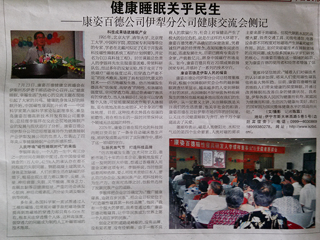 7月23日,康姿百德健康交流盛會在新疆伊犁州蘇伊老干部活動中心舉行,以“健康睡眠、幸福生活”為核心的交流主題引起了與會代表的共鳴。中國磁性寢具的開拓者—第六屆中國科學(xué)家論壇副理事長、秦皇島康姿百德高新技術(shù)開發(fā)有限公司董事長、總經(jīng)理李銀祥就健康睡眠產(chǎn)業(yè)的發(fā)展與現(xiàn)狀進(jìn)行了深入分析??底税俚鹿疽晾绶止究偨?jīng)理董雁玲向與會代表交流了從事健康睡眠產(chǎn)業(yè)四年來的所感所想。7月24日《伊犁晚報》對此次會議作了題為“健康睡眠、關(guān)乎民生”的專題報道。