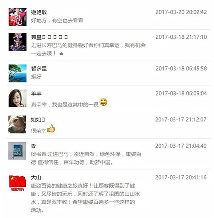 此次“走進(jìn)長(zhǎng)壽巴馬 共譜健康人生”健康之旅活動(dòng)反響熱烈,得到了健身愛好者的廣泛好評(píng)。自前幾篇報(bào)道巴馬健康之旅的文章發(fā)出后,許多健身愛好者都通過在微信公眾平臺(tái)文章下方留言評(píng)論的方式表達(dá)了自己的體會(huì)和感受。