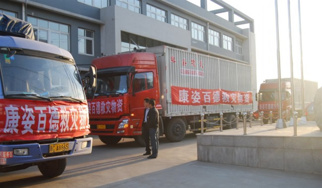 滿(mǎn)救災(zāi)物資的貨車(chē)離開(kāi)康姿百德公司,駛向?yàn)?zāi)區(qū) “捎去我的愛(ài)心,帶上我的祝?!?/strong>“回饋社會(huì),造福人類(lèi)”,始終是康姿百德公司秉承的經(jīng)營(yíng)理念。全國(guó)各地的康姿百德經(jīng)銷(xiāo)商在把幸福和健康帶給人們的同時(shí),也深知自己身上的責(zé)任,不忘奉獻(xiàn)自己的愛(ài)心。他們積極捐款捐物,向?yàn)?zāi)區(qū)人民伸出援助之手。物資車(chē)途經(jīng)北京、河北、山西、河南等地時(shí),當(dāng)?shù)亟?jīng)銷(xiāo)商囑咐司機(jī)一定把這份愛(ài)心物資安全送到災(zāi)區(qū), “捎去我的愛(ài)心,帶上我的祝?!?,這是康姿百德人最強(qiáng)烈的心聲。