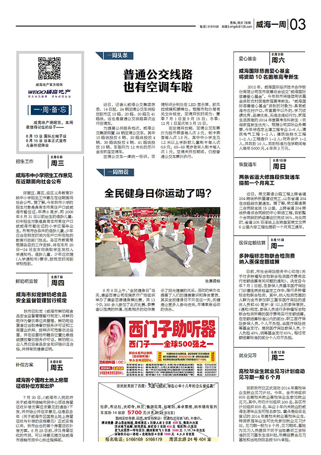 8月8日,為迎接“全民健身日”的到來,山東威??底税俚陆涗N商舉行了“全民健身 快樂同行”大型公益活動啟動儀式,來自市內各縣區(qū)的500多名健身愛好者,組成13個代表隊進行了健身操表演,為這個全民性的節(jié)日送上了喜慶和歡樂,同時也把“天天健身、天天快樂”的理念傳遞給了身邊的每一個人。 本次活動得到了當地有關部門和新聞媒體的高度重視,威海電視臺、《最威?!返刃侣劽襟w進行了現場采訪和專題報道。