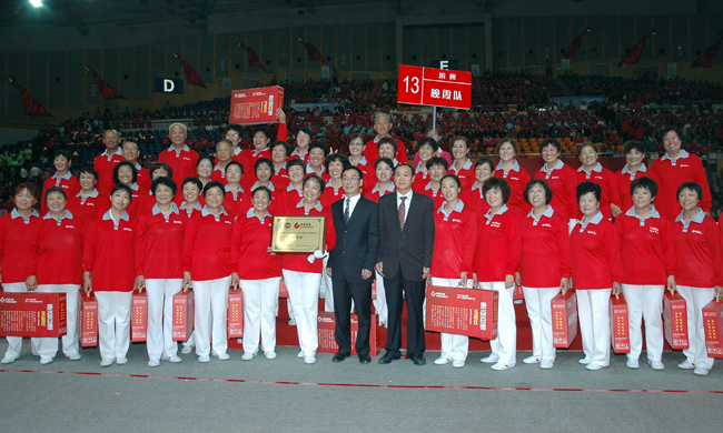 中國消費者協(xié)會副會長母建華、康姿百德公司董事長李銀祥與健身操比賽一等獎獲得者山東濱州晚霞隊隊員合影