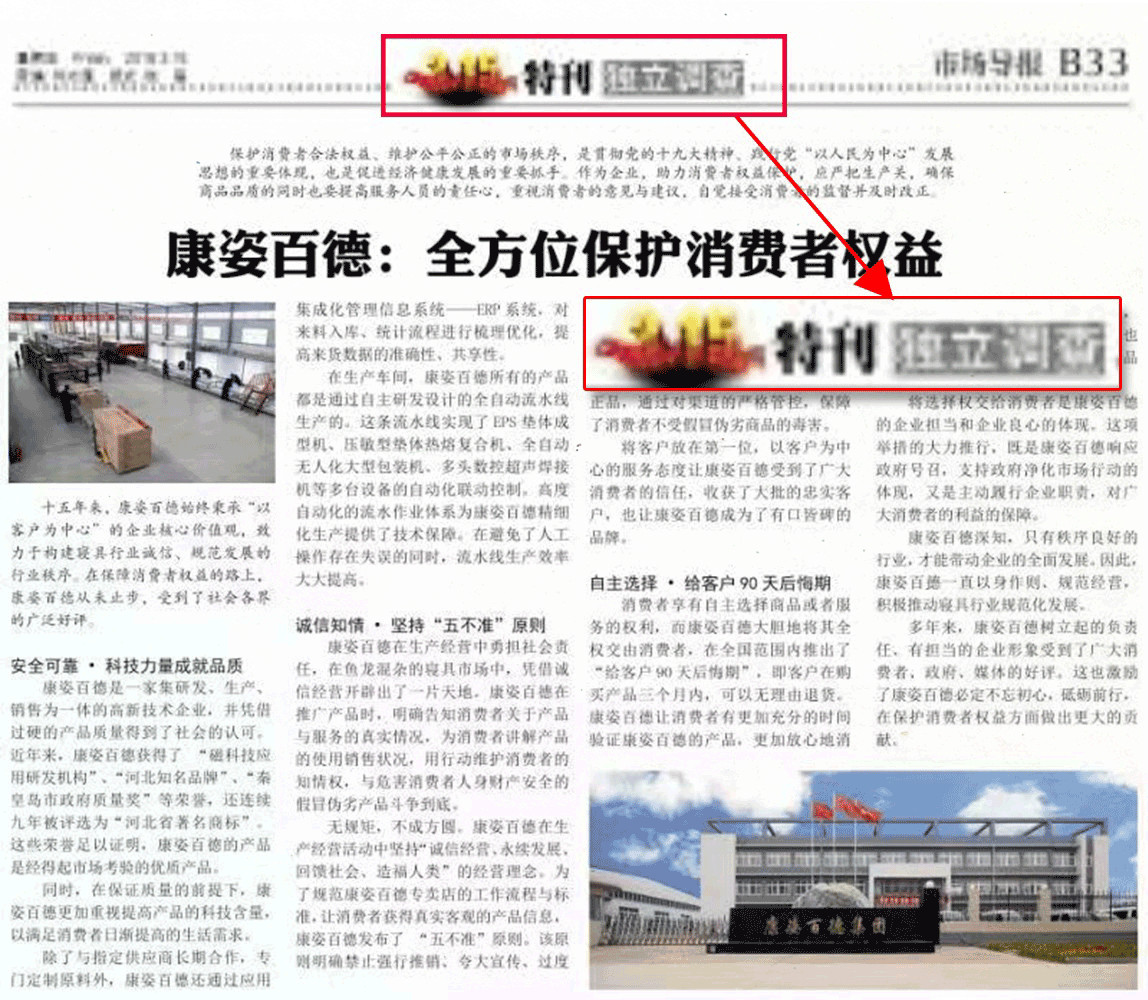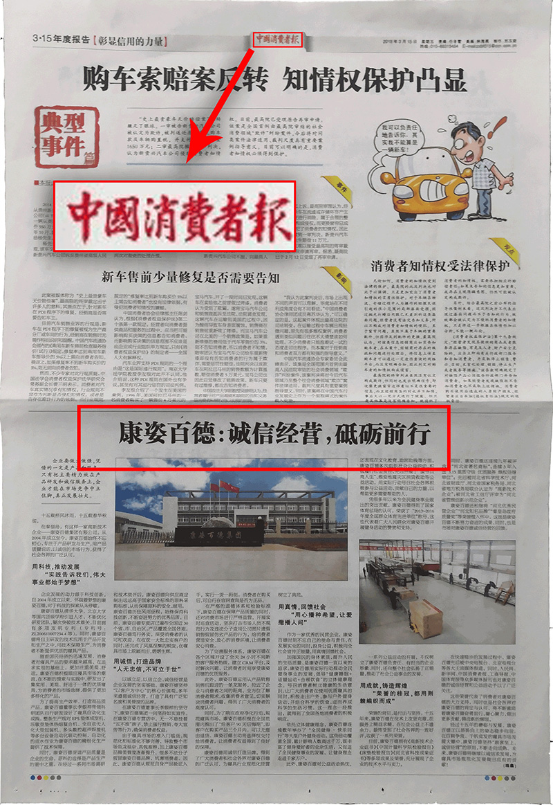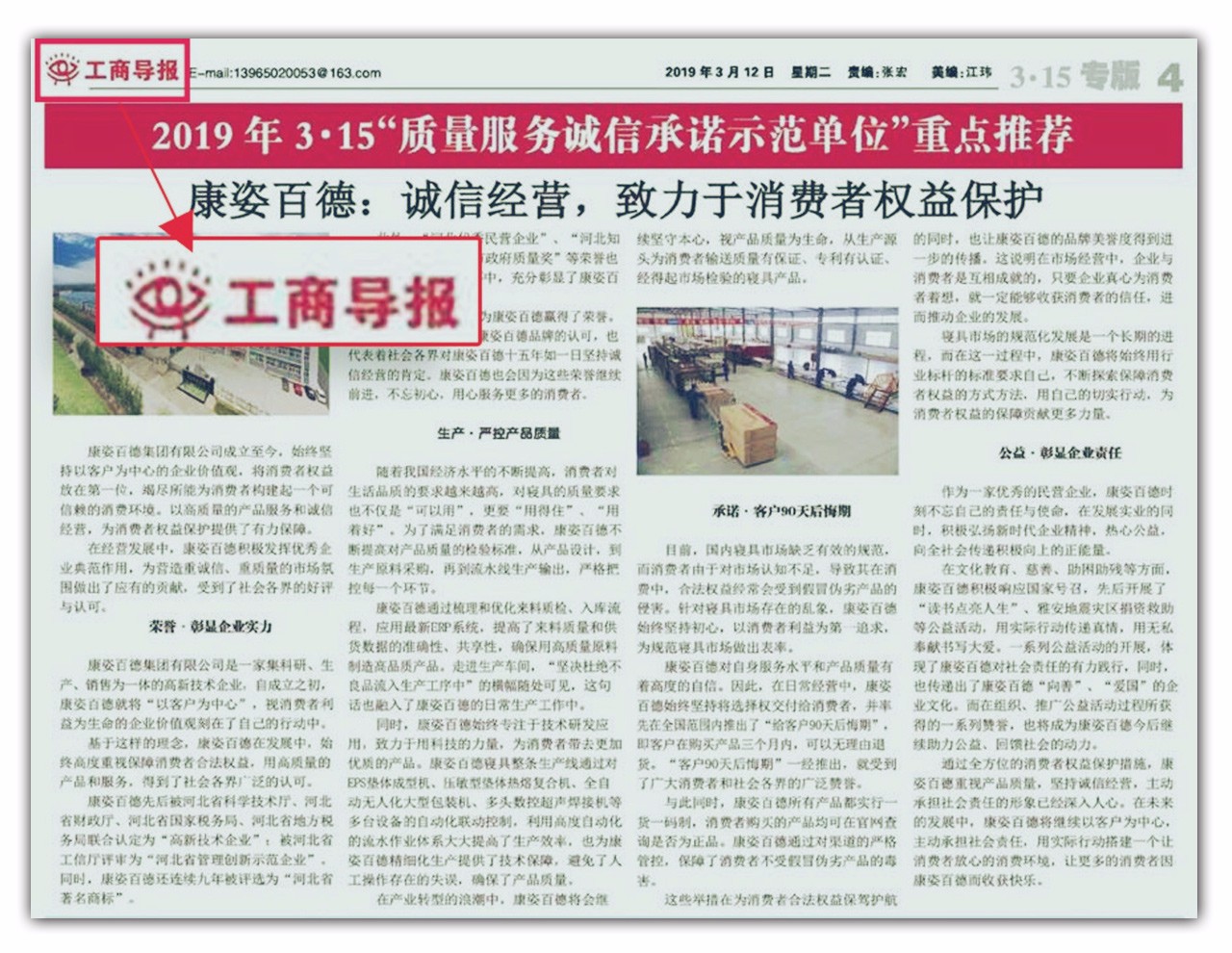 在3·15年度報(bào)告【彰顯信用的力量】專題中,《中國消費(fèi)者報(bào)》對康姿百德“九十天無理由退貨”等一系列誠信經(jīng)營、保護(hù)消費(fèi)者權(quán)益的行為進(jìn)行了專題報(bào)道。