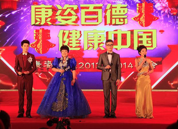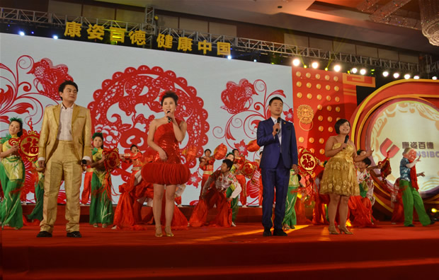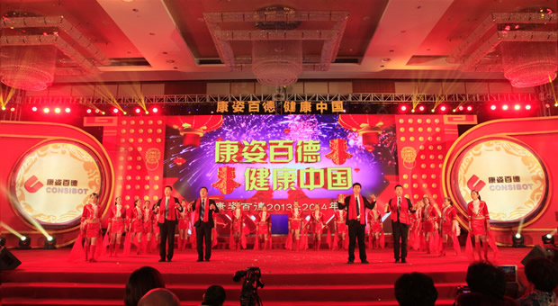 中午1時(shí)許,從全國(guó)各地趕來參加年會(huì)的經(jīng)銷商蜂擁而至。會(huì)場(chǎng)門前,由公司督導(dǎo)師組成的禮儀隊(duì),身著禮服,面帶微笑,列隊(duì)歡迎大家的到來,一句句“過年好”、“歡迎您回家”、“您辛苦了”的問候聲不絕于耳。會(huì)場(chǎng)內(nèi),由公司員工自己搭建的舞臺(tái)燈光閃爍,絢麗多彩,懸掛于舞臺(tái)兩側(cè)的大紅燈籠顯得格外耀眼;舞臺(tái)背景的LED屏幕上,“康姿百德、健康中國(guó)”、“康姿百德2013-2014年會(huì)”等字幕交替顯示;偌大的大廳內(nèi),40張餐桌上擺滿了水果、瓜子、花生、飲料……。大家邊吃邊聊,噓寒問暖,徜徉在幸福和愉悅之中,盡情享受著家一般的親切和溫暖。