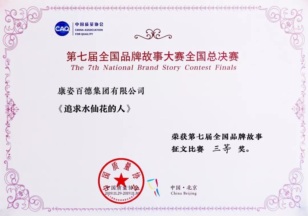 經(jīng)過全國27個(gè)分賽區(qū)、近約450個(gè)作品的激烈角逐和評(píng)選??底税俚录瘓F(tuán)憑借《追求水仙花的人》的主題征文、《質(zhì)量是企業(yè)的生命》的主題演講、《從科學(xué)家走向企業(yè)家的人生飛躍》的主題演講,從全國眾多的知名品牌故事中脫穎而出,分別斬獲了兩個(gè)三等獎(jiǎng),榮獲一項(xiàng)優(yōu)勝獎(jiǎng)。