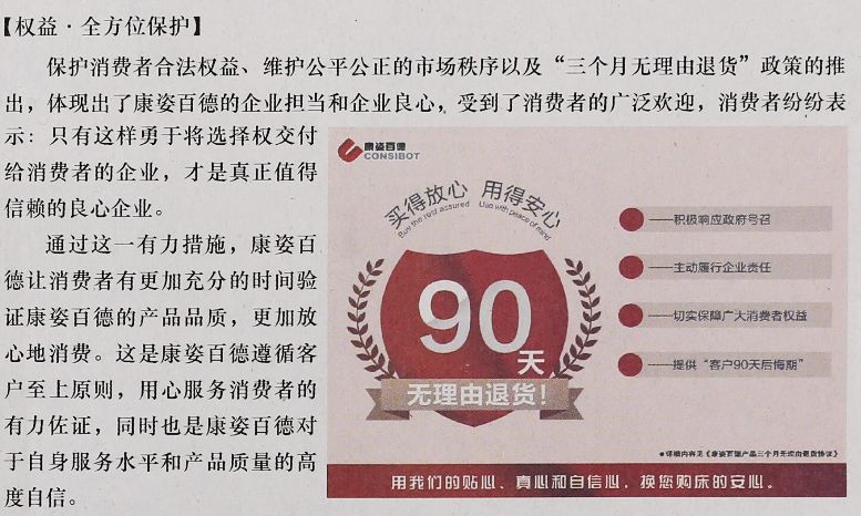 【權(quán)益·全方位保護(hù)】保護(hù)消費者合法權(quán)益、維護(hù)公平公正的市場秩序以及“三個月無理由退貨”政策的推出,體現(xiàn)出了康姿百德的企業(yè)擔(dān)當(dāng)和企業(yè)良心,受到了消費者的廣泛歡迎,消費者紛紛表示:只有這樣勇于將選擇權(quán)交付給消費者的企業(yè),才是真正值得信賴的良心企業(yè)。