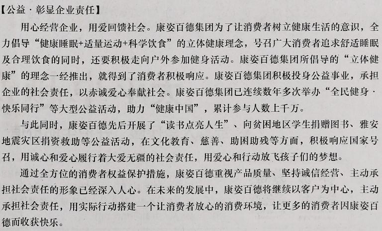 【公益·彰顯企業(yè)責(zé)任】用心經(jīng)營企業(yè),用愛回饋社會。康姿百德集團(tuán)為了讓消費者樹立健康生活的意識,全力倡導(dǎo)“健康睡眠+適量運動+科學(xué)飲食”的立體健康理念,號召廣大消費者追求舒適睡眠及合理飲食的同時,還要積極走向戶外參加健身活動??底税俚录瘓F(tuán)所倡導(dǎo)的“立體健康”的理念一經(jīng)推出,就得到了消費者積極響應(yīng)??底税俚录瘓F(tuán)積極投身公益事業(yè),承擔(dān)企業(yè)的社會責(zé)任,以赤誠愛心奉獻(xiàn)社會。