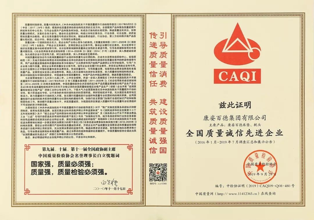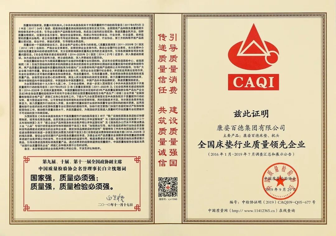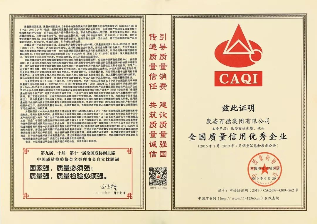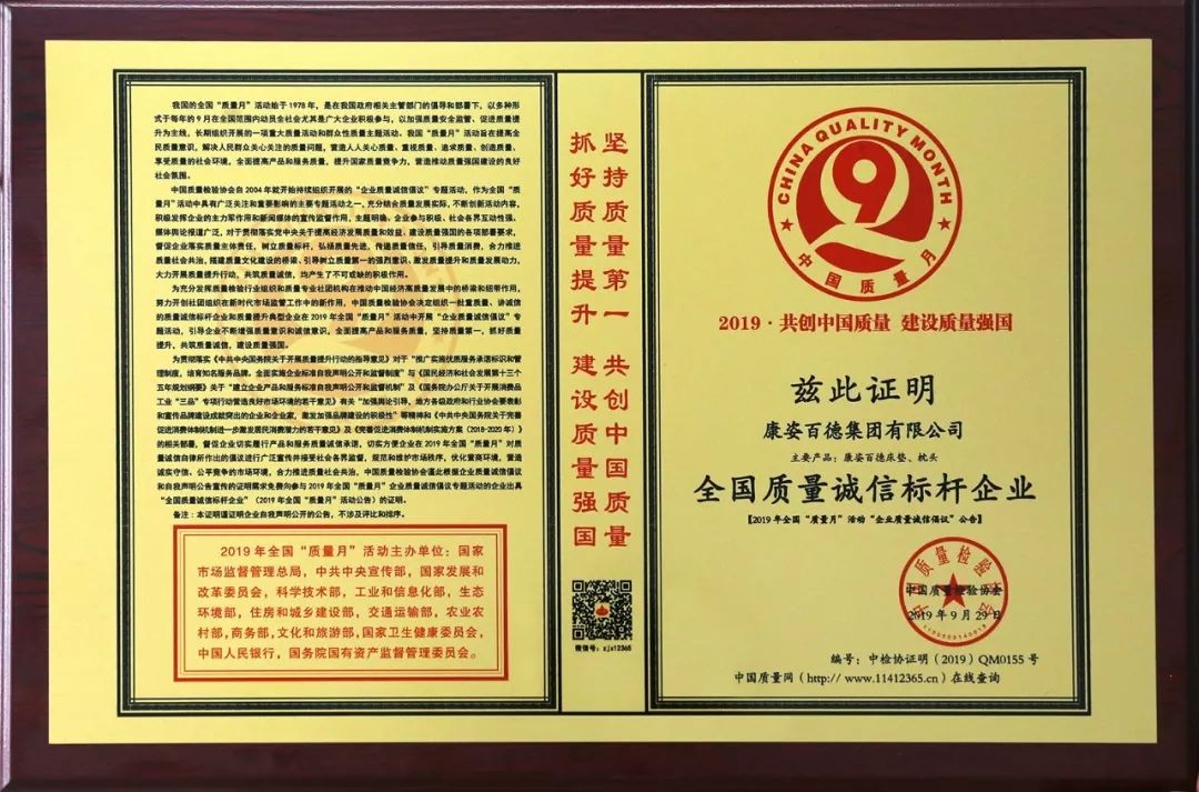在國家市場監(jiān)督管理總局聯(lián)合中共中央宣傳部、國家發(fā)展和改革委員會等14個部門部署開展的2019年“質(zhì)量月”活動中,康姿百德再獲權威機構(gòu)的肯定與認可,被授予2019年度“全國質(zhì)量誠信標桿企業(yè)”。