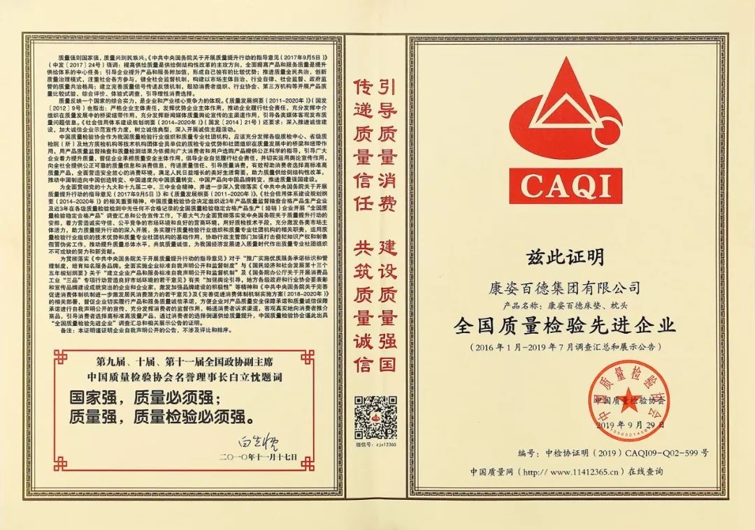 康姿百德產(chǎn)品被評為“全國質(zhì)量檢驗先進企業(yè)”