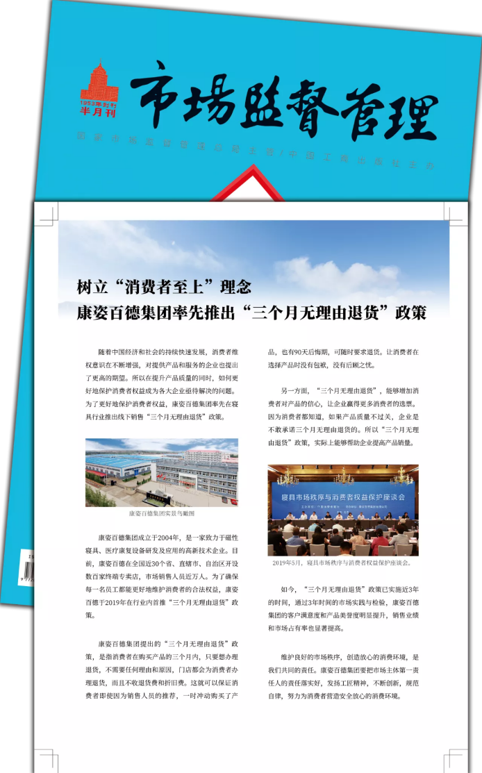 《市場監(jiān)督管理》1953年創(chuàng)刊,前身為《工商行政管理》雜志,曾被新聞出版總署認(rèn)定為雙效期刊,榮獲“第二屆國家期刊百種重點(diǎn)期刊”稱號?!妒袌霰O(jiān)督管理》雜志專業(yè)、權(quán)威、實(shí)用,在市場監(jiān)管系統(tǒng)內(nèi)有著廣泛而深厚的影響力。康姿百德在消費(fèi)者維權(quán)方面,積極響應(yīng)國家市場監(jiān)督管理總局的號召,自主在行業(yè)內(nèi)推行“三個月無理由退貨”政策,贏得了廣大消費(fèi)者和權(quán)威媒體的肯定與認(rèn)可。