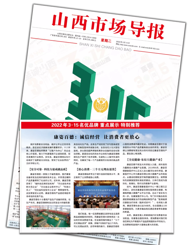 《山西市場導(dǎo)報(bào)》以“康姿百德:誠信經(jīng)營 讓消費(fèi)者更放心”為主題對康姿百德的報(bào)道?!渡轿魇袌鰧?dǎo)報(bào)》是由山西省工商行政管理局主管主辦的機(jī)關(guān)報(bào)。
