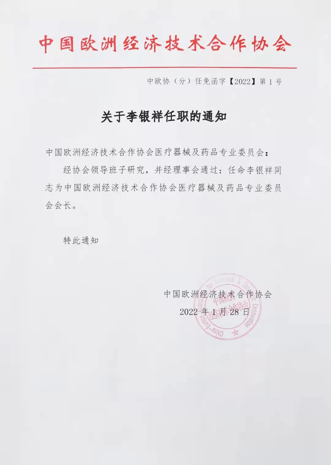 中國歐洲經(jīng)濟技術合作協(xié)會醫(yī)療器械及藥品專業(yè)委員會(以下簡稱“中歐協(xié)會醫(yī)療器械及藥品專業(yè)委員會”),以關注國內(nèi)外相關行業(yè)政策、定期組織醫(yī)療器械和藥品企業(yè)進行國際交流活動等為主要內(nèi)容,構筑了中國與歐洲醫(yī)療器械行業(yè)之間交流合作的橋梁。該協(xié)會隸屬于中歐協(xié)會, 接受中歐協(xié)會的業(yè)務指導和監(jiān)督管理。李銀祥董事長的當選充分說明了我們在相關協(xié)會的影響力。