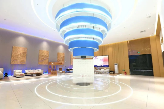 科技展廳的產品展示區(qū),以“科技感”與“舒適睡眠”為設計導向,圍繞“溫暖”“家”“科技”幾個核心元素,實現(xiàn)了科技元素與家居生活的有機結合,構建一個家庭場景式的沉浸空間,一個有溫度的展示環(huán)境。