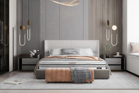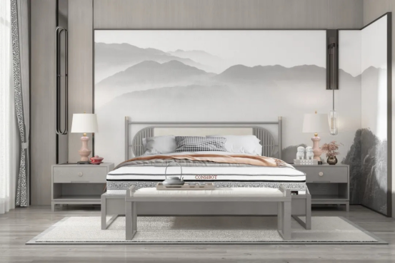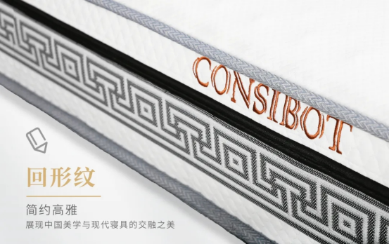 回形紋是中國(guó)傳統(tǒng)的吉祥圖案,象征著永恒和連綿不斷的生命力??底税俚虑逖趴畲矇|圍邊用“回形紋”加以點(diǎn)綴,賦予了吉祥如意、福運(yùn)綿綿的美好寓意,展現(xiàn)了中式美學(xué)與現(xiàn)代寢具的交融之美。同時(shí)也增強(qiáng)了床墊整體的精致感。