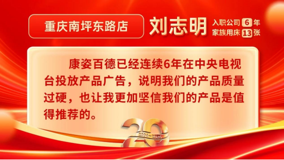 每當(dāng)劉志明給客戶介紹產(chǎn)品,提到我們是上過(guò)央視的品牌,都是滿滿的自豪感?!狈浅s幸成為康姿百德的一名員工,公司良好的品牌形象也給我?guī)?lái)了社會(huì)認(rèn)可度和尊重感,讓我結(jié)識(shí)了很多朋友,收獲了許多快樂(lè)和感動(dòng)。今后,我會(huì)把康姿百德作為自己的終身事業(yè),把好產(chǎn)品推薦給更多的人?!?/span>