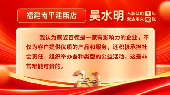 康姿百德20周年專賣店員工的系列故事會(huì)持續(xù)推出,讓我們一起期待其他地區(qū)專賣店員工代表的精彩故事吧!