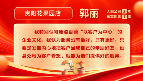 康姿百德20周年專賣店員工的系列故事會持續(xù)推出,讓我們一起期待其他地區(qū)專賣店員工代表的精彩故事吧!