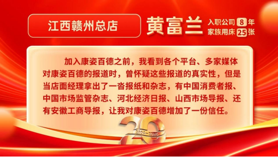 據(jù)黃富蘭回憶,在加入康姿百德時(shí)有一個(gè)小插曲?!爱?dāng)時(shí)是想找份工作,正好看到康姿百德門店在招聘店員,走進(jìn)去后店面經(jīng)理正給應(yīng)聘者做企業(yè)介紹,還介紹到了多家媒體對(duì)康姿百德進(jìn)行過報(bào)道。當(dāng)時(shí)我看到各個(gè)平臺(tái)、多家媒體對(duì)康姿百德的報(bào)道時(shí),曾懷疑這些報(bào)道的真實(shí)性,擔(dān)心是門店作假。店面經(jīng)理看出了我的顧慮,拿出了一沓報(bào)紙和雜志,有中國消費(fèi)者報(bào)、中國市場監(jiān)管雜志、河北經(jīng)濟(jì)日?qǐng)?bào)、山西市場導(dǎo)報(bào)、還有安徽工商導(dǎo)報(bào),讓我對(duì)康姿百德增加了一份信任?!?/span>