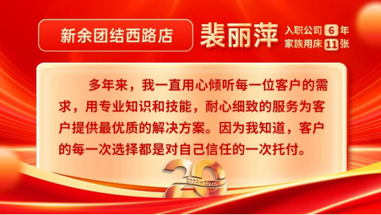 今年是康姿百德集團(tuán)成立20周年。在20年的發(fā)展歷程中,有這樣一群人,他們?cè)谑袌鼋?jīng)營管理過程中,深刻貫徹以客戶為中心的理念,始終把優(yōu)質(zhì)的服務(wù)融于門店經(jīng)營的每個(gè)環(huán)節(jié),也因此得到了客戶的贊賞和認(rèn)可。他們就是康姿百德專賣店的員工。本期和您分享的是康姿百德江西地區(qū)專賣店員工代表的故事。