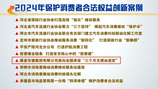 2025年3月15日,康姿百德集團(tuán)有限公司面向全國承諾“三個(gè)月無理由退貨”成功入選河北省消保委評(píng)選的“2024年保護(hù)消費(fèi)者合法權(quán)益創(chuàng)新案例”,并被河北省消保委作為典范,向全社會(huì)推廣。